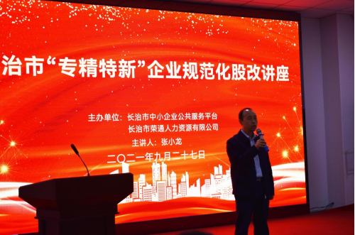 2021年9月27日,由长治市中小企业公共服务平台和山西荣通人力资源有限公司共同主办的长治市“专精特新”企业规范化股改培训在荣通人力资源服务产业园成功举办。市中小企业服务中心相关领导出席并讲话。50多家“专精特新”企业高管参训。此次培训邀请到了太原高新金控股权服务有限公司副总经理、...
